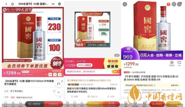 事實(shí)上,由于茅臺(tái)價(jià)格持續(xù)拉高,從而為五糧液、瀘州老窖等一線酒企的高端產(chǎn)品讓出價(jià)格調(diào)整空間。但細(xì)觀消費(fèi)市場(chǎng),國(guó)窖1573的價(jià)格并沒(méi)有完全突破千元。北京商報(bào)記者發(fā)現(xiàn),52度500ml國(guó)窖1573經(jīng)典裝官方旗艦店原價(jià)1499元/瓶,活動(dòng)售價(jià)1299元/瓶。反觀其他電商平臺(tái),該產(chǎn)品活動(dòng)售價(jià)大多在1000元左右。其中,天貓旗艦店此前售價(jià)為1299元,活動(dòng)售價(jià)僅969元;1919平臺(tái)此前售價(jià)為1399元,活動(dòng)售價(jià)999元;酒仙網(wǎng)、蘇寧易購(gòu)等活動(dòng)售價(jià)為909元和969元。