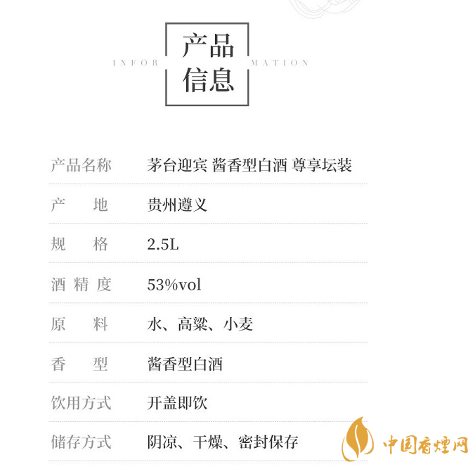以上是小編整理的有關(guān)茅臺迎賓尊享壇裝多少錢的最新信息,相信在座的朋友們聽到小編的介紹有所認識,但是小編在這里提醒一句以上信息整合于網(wǎng)絡,更多最新最實用的資訊請持續(xù)關(guān)注香煙網(wǎng)。
