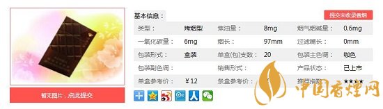 這三款細支煙的參數(shù)完全相同,具體參數(shù):一盒20支,煙長97mm,焦油量8mg,煙堿量0.6mg,一氧化碳量6mg。