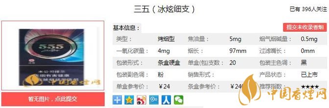 555品牌首款爆珠細支產(chǎn)品,以新鮮獨特、瞬間冰爽的“冰酒爆珠”,令消費者感受到“冰與火”的多重享,包裝十分炫酷,科技感十足。只有5mg焦油的細支涼煙,口感涼爽舒適,算是一款比較出色的涼煙。經(jīng)香煙網(wǎng)小編市場調(diào)查三五冰炫細支售價為24元/包。