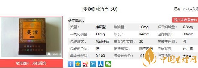 貴煙國酒香30煙支長84mm,過濾嘴長30mm,“玉液珠”濾嘴:純天然材料包裹國酒香特征原料,給消費(fèi)者強(qiáng)烈的國酒香風(fēng)格感受。下面我們一起來看貴煙國酒香30的參數(shù)信息:焦油量:10mg 煙堿量:0.9mg 一氧化碳量:11mg