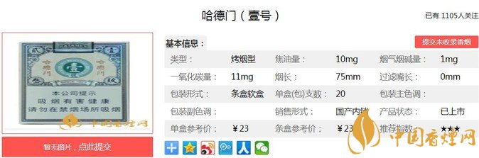 哈德門(壹號(hào))煙支長:75mm,烤煙型,包裝形式:條盒硬盒(每盒 20支,每條 10 盒)。《韋氏詞典》說對(duì)某段往日時(shí)光的愁悶或極度感傷的緬懷或回溯之情,這也是山東中煙的一張情懷牌。我們一起來看哈德門(壹號(hào))的參數(shù)信息:焦油量:10mg 煙堿量:1.0mg 一氧化碳量11mg