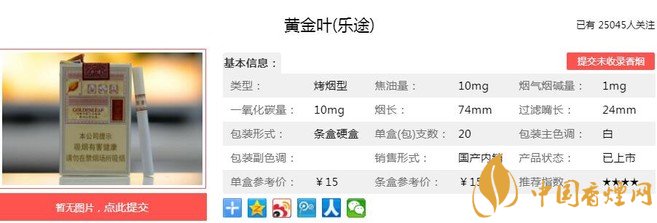 黃金葉樂途煙支長74mm,過濾嘴長24mm,煙支雖然短但滿足感一點(diǎn)都不弱,煙氣濃度、爆發(fā)力特別好,還兼具舒適感與輕松感,性價(jià)比高。下面我們一起來看黃金葉樂途的參數(shù)信息:焦油量:10mg 煙堿量:1.0mg 一氧化碳量:10mg