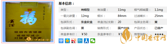 貴煙(天下第一福)煙支長:84mm,烤煙型,過濾嘴長:25mm,明黃色調(diào)的運(yùn)用給消費(fèi)者以高貴、大氣的視覺享受,呈現(xiàn)高檔卷煙的形象特征。下面我們一起來看貴煙(天下第一福)的參數(shù)信息:焦油量:11mg 煙堿量:1.1mg 一氧化碳量:12mg