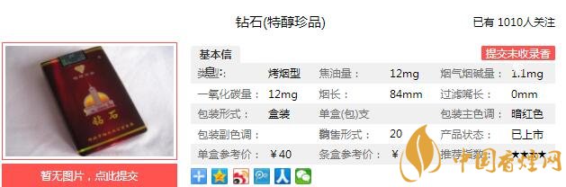 鉆石特醇珍品煙支長84mm,選用了高透氣度高強(qiáng)度的奧地利盤紙和過濾效率高的醋酸咀棒,運用新技術(shù),加長了濾咀,使卷煙的焦油等成份得到更加有效的截留,加工工藝先進(jìn),裝璜設(shè)計清新爽目,顯示產(chǎn)品的高檔。下面我們一起來看鉆石特醇珍品的參數(shù)信息:焦油量:12mg 煙堿量:1.1mg 一氧化碳量:12mg