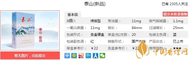 泰山(新品)卷煙精選優(yōu)質(zhì)進口煙葉,采用純天然香精香料,香氣清雅濃馥、豐滿、諧調(diào)、吸味純正、口感細膩、余味純凈舒適,“清新自然、至尊泰山”是卷煙中的高檔精品。經(jīng)香煙網(wǎng)小編市場調(diào)查泰山新品售價為22元/包。