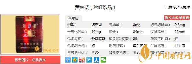 黃鶴樓的煙大部分還是很有名氣的,什么1916、峽谷柔情、雅韻這些系列大家口熟能祥。黃鶴樓的煙在煙民中口碑還是不錯(cuò)的。作為樓煙“珍品”系列,黃鶴樓(軟紅珍品)可以在黃鶴樓眾多香煙中被冠以珍品之名,可見也是不俗。下面香煙網(wǎng)小編就給大家介紹下黃鶴樓(軟紅珍品)的參數(shù)和口感。