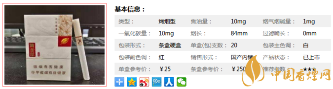 | 煙長(zhǎng):84mm | 過(guò)濾嘴長(zhǎng):25mm | 包裝形式:條盒硬盒 | 單盒(包)支數(shù):20 |