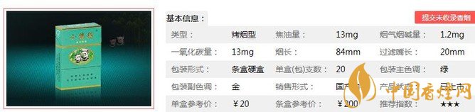 | 類型 :烤煙型 | 焦油量 :13mg | 煙氣煙堿量 :1.2mg | 一氧化碳量 :12mg |
