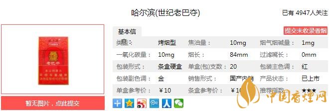 哈爾濱老巴奪煙支長(zhǎng)84mm,過濾嘴長(zhǎng)25mm,使用從植物中提取的天然香原料和天然植物保潤(rùn)技術(shù),保證卷煙舒適感;以清甜香風(fēng)格為基礎(chǔ),采用創(chuàng)新性中支(7.0mm)規(guī)格,在保證滿足感前提下,注重?zé)熛愕拇己透?、舒適感和甜潤(rùn)感,同時(shí)兼顧卷煙安全性。下面我們一起來看哈爾濱老巴奪的參數(shù)信息:焦油量:10mg 煙堿量:1.0mg 一氧化碳量:10mg