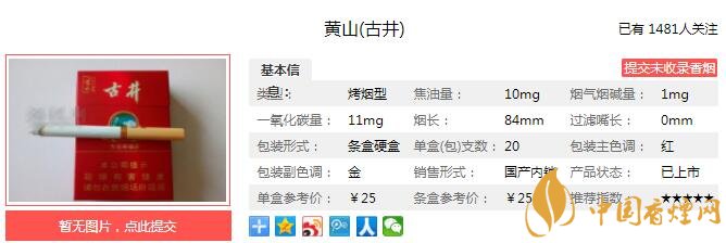 古井是安徽中煙與古井集團(tuán)合作研制產(chǎn)品,抽吸時唇舌喉處除了感受到清香酒味,又有著較為清雅的焦香之味,夾雜于其中。為了突出古井的酒香,甚至把焦甜味降低了一些。煙氣的醇度,成團(tuán)性,順暢度來說是非常超值的。經(jīng)香煙網(wǎng)小編市場調(diào)查黃山古井售價為25元/包。