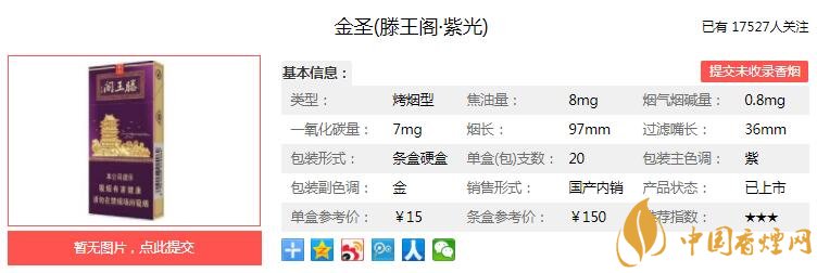 以上便是由香煙網小編為大家介紹的關于金圣滕王閣紫光好抽嗎 金圣滕王閣紫光價格及口感分析的相關信息,想要了解更多有關內容請點擊:白沙尚品藍多少錢一包 白沙尚品藍口感及參數介紹