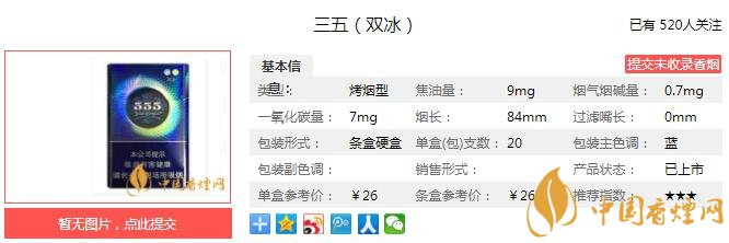 555牌卷煙創(chuàng)牌于1895年,創(chuàng)始人Albert Levy爵士在美國(guó)獲得靈感并在英國(guó)注冊(cè)State Express 555品牌,是英美煙草公司出品的有著悠久歷史的著名品牌,國(guó)內(nèi)煙民熟悉的有555金、555弘博、555環(huán)尊、555藍(lán)尚、555國(guó)際等品種和系列。555屬英式烤煙型卷煙。下面就由香煙網(wǎng)小編帶大家一起來了解三五雙冰的相關(guān)信息。