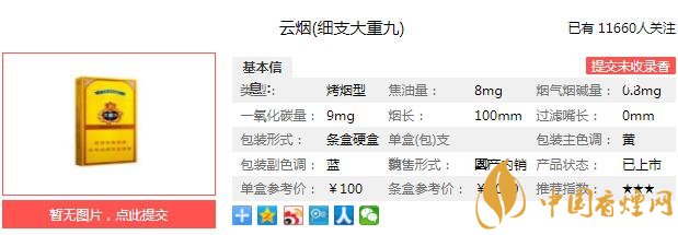 云煙(細(xì)支大重九)煙支長100mm,過濾嘴長35mm,定位在細(xì)支煙品類。深褐色濾嘴加朱砂紅大重九字樣,接藍(lán)底金線回紋分割,大重九標(biāo)配。煙支部分采用素紙裹制,簡單至極,雖然細(xì)但煙絲填充緊致飽滿。下面我們一起來看云煙(細(xì)支大重九)的參數(shù)信息:焦油量:8mg 煙堿量:0.8mg 一氧化碳量:8mg
