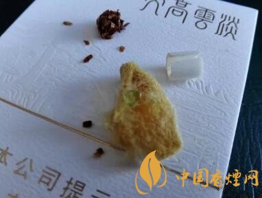 一小段材質(zhì)較硬的過濾嘴。海綿體內(nèi)包裹著的,是一顆淡綠色的香珠。同時,過濾嘴紙張內(nèi),附著一層黃色的紙張。總之,過濾嘴里內(nèi)容豐富的很。