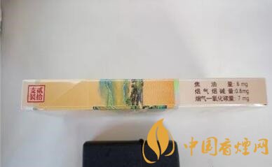 煙盒的左側(cè)連貫著圖案,下面是這款煙的理化指標(biāo):焦油量:8mg、煙氣煙堿量:0.8mg、煙氣一氧化碳量:7mg等,在左側(cè)上方還有類似印章一樣的正方形紅色字體,標(biāo)明內(nèi)有貳拾支裝。