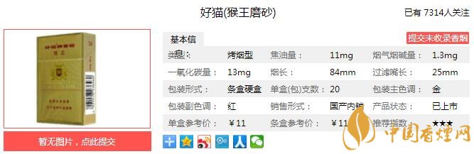 好貓牌香煙(猴王磨砂)”,簡(jiǎn)稱“磨砂好貓”。產(chǎn)品的商標(biāo)保持原猴王包裝裝潢用料和設(shè)計(jì)特色,配方設(shè)計(jì)保持“猴王(磨砂)”卷煙產(chǎn)品吸食自然、醇和、明快的香氣特征和吸味風(fēng)格。經(jīng)香煙網(wǎng)小編市場(chǎng)調(diào)查好貓(猴王磨砂)售價(jià)為11元/包。