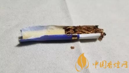 剖開濾嘴,絲束長度并不長,14mm左右。降焦孔正好在絲束的中部位置。水松紙內(nèi)部還襯有一層類似綿紙的細(xì)軟質(zhì)層。絲束的顏色比較淺,前段稍稍變黃一些。整段顏色均勻。