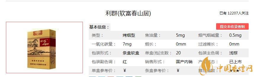 煙葉資源,秉承純煙葉打造,不添加任何香精香料,“”有“純天然、低焦低害”、“華夏第一支”的美譽(yù)。包裝設(shè)計(jì)上,無(wú)論是外包裝上還是煙支圖案,利群(富春山居)都完美展現(xiàn)了傳統(tǒng)文化之美和人文氣息。以帶給目標(biāo)消費(fèi)人群“本色本香、自然純正”的高品質(zhì)品吸感受。目前利群(富春山居)主要有軟包和硬盒兩種規(guī)格,零售價(jià)格均超過(guò)5000元一條,雖然價(jià)格高昂,大多數(shù)煙民都抽不起。