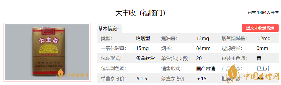 青“大豐收”為中國第一個卷煙共享品牌,是隸屬于中國煙草總公司的卷煙商標,制煙工藝經典純正,致力于找尋卷煙最原始自然的口感,化繁為簡,不加香精香料,品出煙草本真的味道。下面便是大豐收(福臨門)的基本參數(shù):煙支長度:84mm 焦油量:13mg 煙氣煙堿量:1.2mg 煙氣一氧化碳量:15mg.