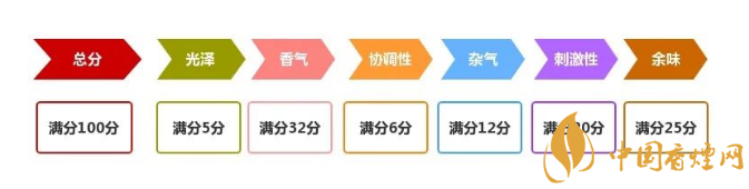 煙草行業(yè)對(duì)于成品卷煙明確的評(píng)價(jià)標(biāo)準(zhǔn)是百分制的感官評(píng)吸國(guó)標(biāo)賦值法打分,質(zhì)量評(píng)價(jià)指標(biāo)由光澤、香氣、雜氣、刺激性、余味、協(xié)調(diào)6項(xiàng)指標(biāo)組成,根據(jù)眼觀手觸吸食掌握的性狀打分,分值越高代表其品質(zhì)越好。