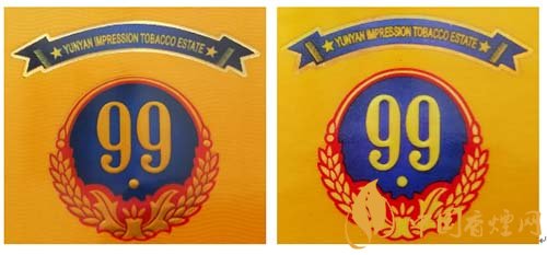 真品卷煙:1.商標LOGO稻穗圖案凸起,整體立體、飽滿,大豐收。2.99數(shù)字筆畫圓潤、飽滿,下面圓點尤為突出。3. 藍色底紋顏色重,邊緣向中間色彩過渡自然。4.商標紙流水紋路清晰可見。