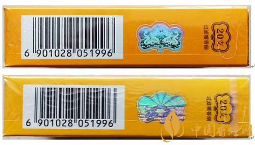 假冒卷煙:該款假冒卷煙花紋圖案燙金色彩暗淡,線條浮在商標紙上。如圖上真下假