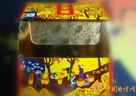 正面包裝一眼看過去很是花哨,仔細一看,首先給人一種喜慶的感覺,三分之二的正面被一副萬柿圖覆蓋,圖案的底色為黃色,上面有成熟的紅色的柿子,還有農(nóng)民挑著收割好的柿子回家的繁榮景象,鄉(xiāng)土氣息,繁榮氣息,喜慶氣息很是濃郁,盒子上部的中央豎款的黃金葉三字真可謂是畫龍點睛,讓這幅盛世景象更加生動。