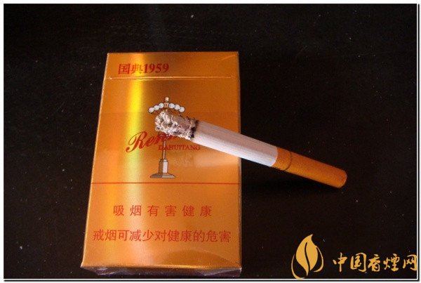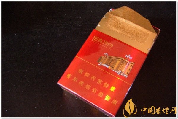 人民大會(huì)堂國(guó)典1959外包裝色調(diào)呈現(xiàn)為雙色系,一面為鮮紅色,另一面為金黃色。在正面的開(kāi)盒的部位上有著金色的 “人民大會(huì)堂”字樣。煙盒的中間部分略上是“國(guó)典1959”,接著是人民大會(huì)堂圖案。煙盒的下部分是警示語(yǔ)言,“吸煙有害健康,盡早戒煙有益健康”。 該款香煙的煙盒背面是金黃色調(diào),上部分是也就是煙盒的左上角是“國(guó)典1959”,煙盒的正中是天安門(mén)禮燈圖案。