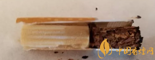 剖開歐免The King濾嘴,是經(jīng)典的一段式醋酸纖維絲束濾嘴段。從絲束的顏色變化,很容易看到降焦孔開在了絲束的前1/3位置,顏色變化均勻。降焦孔后,每個孔位置,有條帶狀的顏色加深,是空氣介入流動所致。從煙絲外觀看,煙葉的品級非常好,用料實。攤開煙絲,看到的是明黃、棕黃的烤煙煙絲比例較大,間雜有比例稍小的深棕色的晾煙煙絲,未見涂布制絲和膨脹制絲。里面混雜與切成薄片狀的煙梗。#p#副標(biāo)題#e#