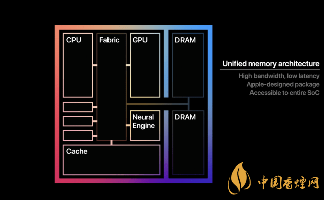 它與iPhone和iPad里面的蘋果芯片非常相似,只是功能更強(qiáng)大。它利用了蘋果公司的統(tǒng)一內(nèi)存架構(gòu)(UMA),這意味著全部?jī)?nèi)存(DRAM)與需要訪問內(nèi)存的各種部件(比方說CPU、GPU、圖像處理器以及神經(jīng)引擎)都是在同一塊芯片上。其結(jié)果是,整塊芯片都可以訪問數(shù)據(jù),而不需要在不同部件之間復(fù)制數(shù)據(jù),也不需要進(jìn)行互連。對(duì)內(nèi)存的訪問有著極低的時(shí)延與極高的帶寬。其結(jié)果是更低功耗、更好性能。