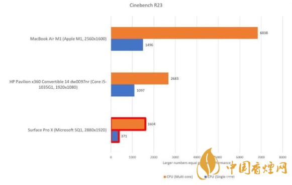 Maxon 的 Cinebench 的結果顯示 M1 也占據了絕對的領先優(yōu)勢,單核和多核成績分別為 1496 分和 6838 分,輕松擊敗 Surface Pro X 的 371 分和 1604 分。