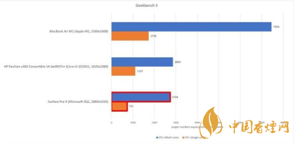 MacBook Air 在 Geekbench 5 的單核和多核測試中都碾壓了 Surface Pro X。蘋果的新筆記本在單核過程中獲得了 1730 分,比 Surface 的分數高出 1000 多分。多核測試則顯示出更大的差距,MacBook Air 的成績?yōu)?7454 分,而 Surface 的成績?yōu)?2734 分。