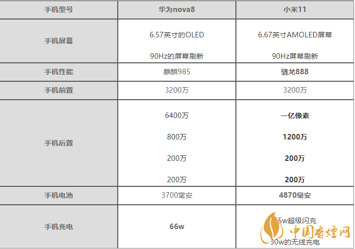 華為nova8搭載3700毫安的電池,支持66w的充電速度。小米11搭載4870毫安的電池,支持55w的有線充電和30w的無線充電