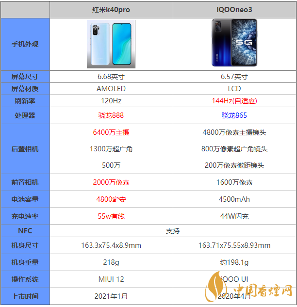 紅米k40pro這款手機(jī)可將會(huì)是最為便宜的驍龍888手機(jī),那么這款手機(jī)和iQOOneo3相比較的話到底是誰(shuí)占有著更加優(yōu)秀的性能表現(xiàn),哪款手機(jī)更值得入手?下面香煙網(wǎng)小編將為大家介紹這兩款手機(jī)的參數(shù)對(duì)比情況,感興趣的朋友一起來(lái)看看吧!