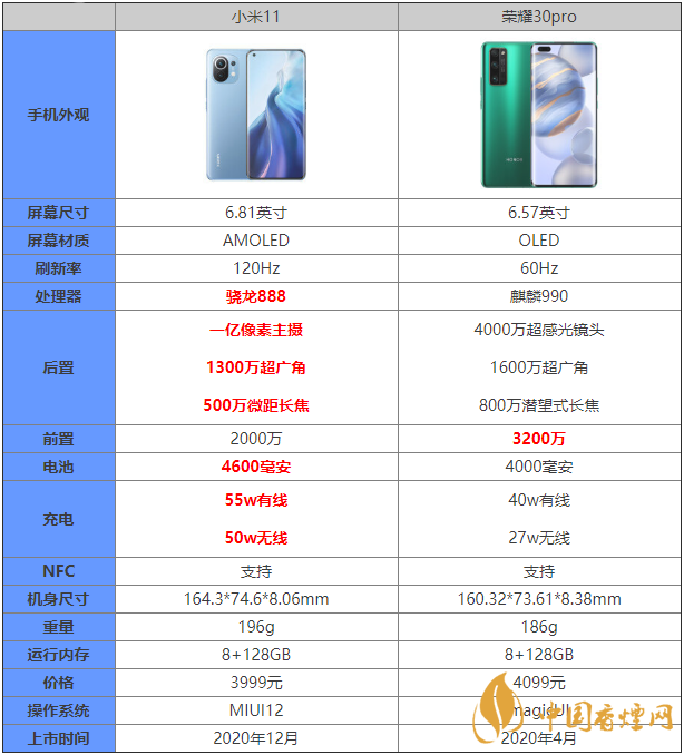 小米11作為今年最強(qiáng)機(jī)型,許多小伙伴對(duì)這款手機(jī)都十分關(guān)注,那么這款手機(jī)和榮耀30pro這兩款手機(jī)的區(qū)別是什么?哪款手機(jī)更值得入手?下面香煙網(wǎng)小編為大家?guī)碜钚碌男∶?1和榮耀30pro參數(shù)對(duì)比,感興趣的朋友快來看看吧。