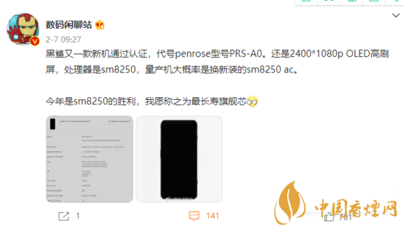 “黑鯊又一款新機(jī)通過認(rèn)證,代號(hào)penrose型號(hào)PRS-A0。還是2400*1080p OLED高刷屏,處理器是sm8250,量產(chǎn)機(jī)大概率是換新裝的sm8250 ac。”