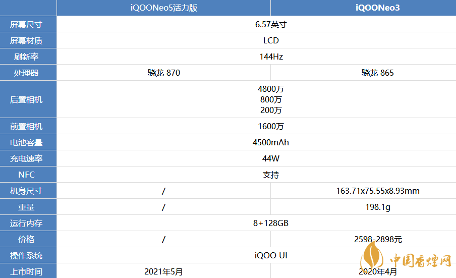 以上就是香煙網小編為大家?guī)淼膇QOONeo5活力版和iQOONeo3區(qū)別對比-參數配置相關資訊,以上資訊全來自網絡,更多最新最實用的資訊請持續(xù)關注香煙網。