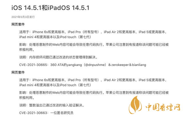 漏洞可被利用制作惡意網(wǎng)頁內(nèi)容導(dǎo)致任意代碼執(zhí)行,蘋果已在 iOS 14.5.1 系統(tǒng)上解決了該問題。