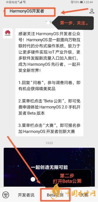 另外一種比較簡單的方法就是微信申請鴻蒙公測資格。關(guān)注HarmonyOS開發(fā)者公眾號!菜單欄點擊“Beta公測”,即可免費申請體驗HarmonyOS 2.0 手機(jī)開發(fā)者Beta版本,等待審核通過了即可。