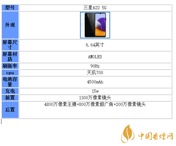 以上就是小編收集到的三星A22 5G參數(shù)配置詳情-三星A22 5G性能分析的相關內(nèi)容,以上內(nèi)容均來源于網(wǎng)絡,僅供參考,一切以實際為準,更多最新數(shù)碼資訊請關注香煙網(wǎng)。