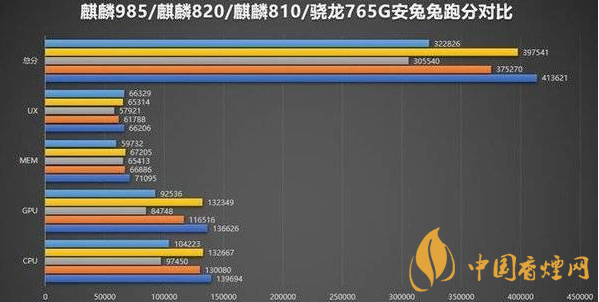 同時(shí)從麒麟985/麒麟820/麒麟810/驍龍765G安兔兔成績(jī)橫向?qū)Ρ葓D來(lái)看