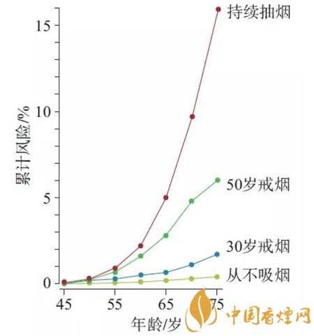 2004 年,著名的《英國癌癥雜志》 發(fā)表了經(jīng)典論文,詳細統(tǒng)計了英國等歐洲國家不同群體男性的肺癌死亡率。從圖上不難看出,75歲吸煙人群死于肺癌的概率是16%,比不吸煙人群高了將近50倍。換算一下,也就是說6個吸煙的人里面會有1位75歲之前就死于肺癌。更可怕的是,如果每天吸煙量超過5支,那么4個人里,就會有1位死于肺癌。