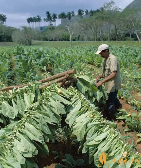 之所以綠斑在古巴雪茄上經(jīng)??梢?jiàn)是因?yàn)楣虐脱┣训闹圃爝^(guò)程中,有吊干(curing)這一環(huán),在煙葉收成以后,為了要除去多余的水份,農(nóng)夫們會(huì)把一雙一雙的煙葉用針線穿起,然后在倉(cāng)庫(kù)中吊制。