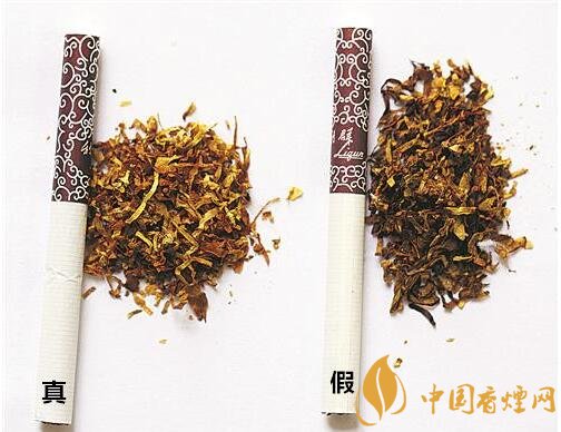 真煙煙絲切絲寬度均勻,煙絲疏松、光澤油潤性好、呈檸檬黃色、含碎末少,煙絲結(jié)構(gòu)為葉絲、膨脹葉絲;假煙制絲工藝粗糙,色澤發(fā)暗無光澤、煙絲中含碎末較多,摻有膨脹梗絲和再造煙葉。