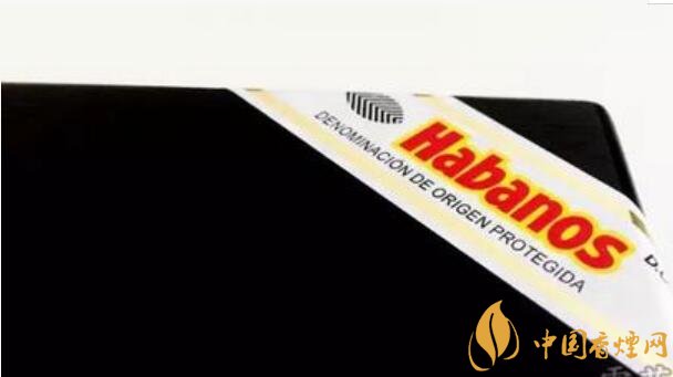 紅色粗體的“Habanos”被黃色描邊加亮,左邊是黑色條紋的煙草葉圖案,頂端和底部是二條金色的粗線條,在標(biāo)簽底部印有DENMOINACION DE ORIGEN PROTEGIDA字樣,代表受保護的原產(chǎn)地名稱。在標(biāo)簽的右上角還有一個D.O.P.,是原產(chǎn)地保護的縮寫。這個標(biāo)簽應(yīng)該是最不容易被忽略的Habanos標(biāo)志了。