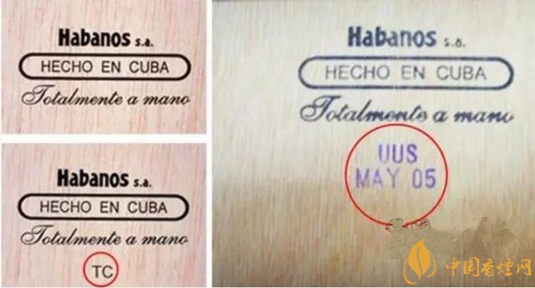 細(xì)心的你還會注意到在紙盒或木盒的底部,有一個郵戳一樣的東西。這個簡易的郵戳是這盒雪茄的工廠代碼和生產(chǎn)日期,UUS是工廠代碼,MAY 05 則表示是2005年5月。