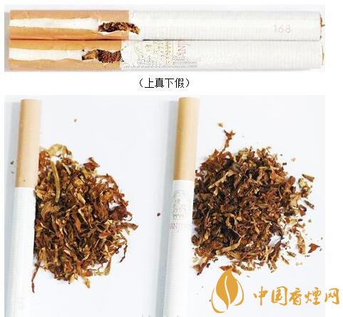 真煙煙支采用單一醋纖濾嘴,長(zhǎng)度為24mm,煙絲切絲寬度均勻,煙絲疏松、光澤油潤(rùn)性好、呈檸檬黃色、含碎末少,煙絲結(jié)構(gòu)為葉絲、膨脹葉絲、膨脹梗絲;假煙煙支過(guò)濾嘴較短,長(zhǎng)度約為20mm,制絲工藝粗糙,色澤發(fā)暗無(wú)光澤、煙絲中含碎末較多,大量梗絲未經(jīng)過(guò)膨脹處理,一般無(wú)膨脹葉絲,與真品特征存在明顯差異。