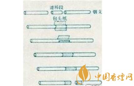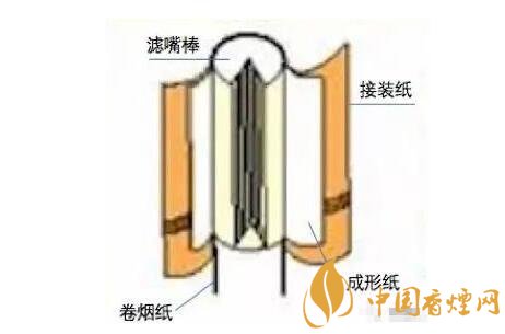 空腔濾嘴:空腔濾嘴是屬于二元復(fù)合濾嘴的一種,二元復(fù)合濾嘴通常是一段濾材為醋酸纖維,另一段為皺紋紙或生產(chǎn)過(guò)程中摻入添加劑(如活性炭)的醋酸纖維??涨粸V嘴是屬于后端為皺紋紙的那種,因?yàn)楹蠖藶橹锌眨瑸榱瞬皇蛊渌?,而醋酸纖維太軟,所以利用皺紋紙做成中空型。因其有一段規(guī)則的空腔, 形成一個(gè)低壓通道,抽吸時(shí)吸阻小, 能夠顯著提高對(duì)煙氣中焦油的過(guò)濾效率,有效地減少焦油和一氧化碳的釋放量。