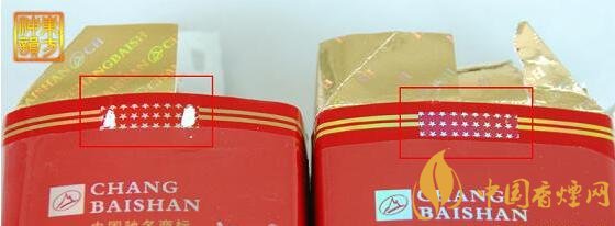 如圖一、圖二白色框標注所示,真煙外包裝采用專用紙張印刷,條包和小包圖案及文字顏色一致,顏色光亮、鮮艷,字跡清晰、完整,表面著色均勻、富有光澤,"長白山"三字凸感明顯。假煙商標圖案印刷粗糙、不清晰,文字有偏色、燙金色澤黯淡,字跡不清,表面著色不均,光澤差且模壓圖案或文字凸感不夠。真煙煙盒表面有明顯的豎條紋,假煙則沒有。